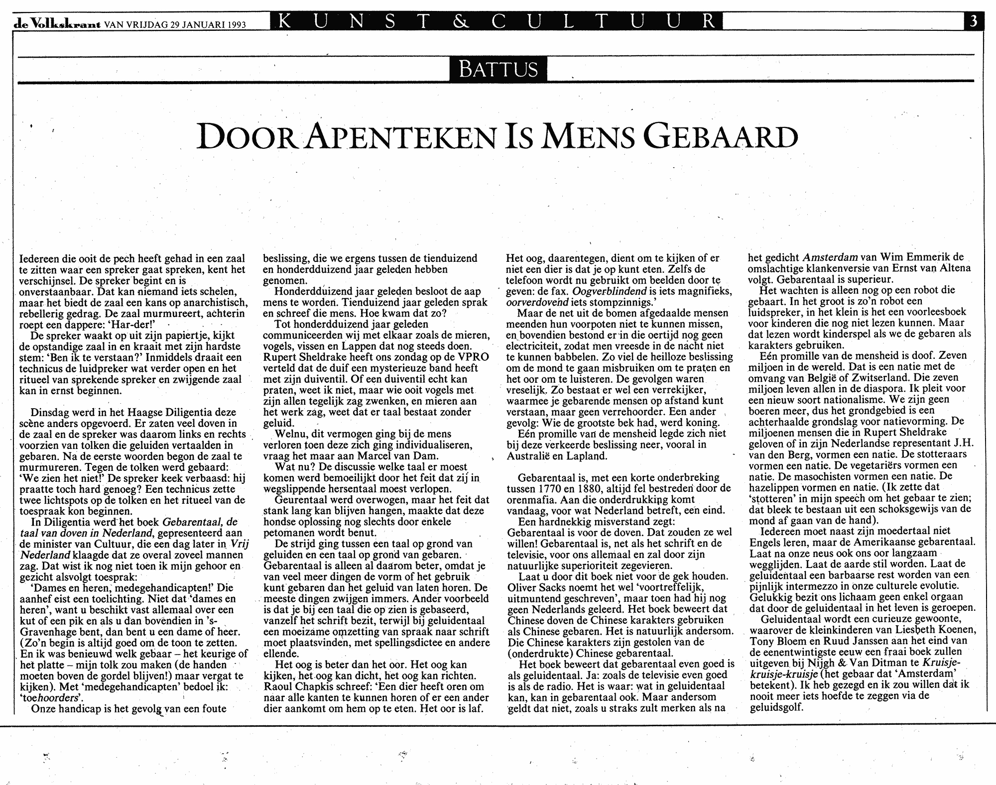 John de Graaf schrijft in de Haagsche Courant dat gebarentaal gewoon een vorm van communicatie is. Ruud Janssen komt aan het woord zeggende dat maar vijf procent van de dove kinderen ook dove ouders heeft. 'In de laatste tien jaar zie je steeds meer niet-dove ouders gebarentaal leren, zodat zij eerder met hun dove kind kunnen spreken. Een enorme vooruitgang. Op die weg moeten we verder.'
